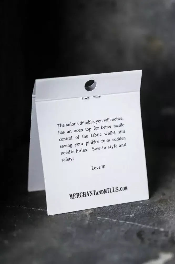 • Solid brass tailor's thimble, by Merchant & Mills, with a hole at the top.