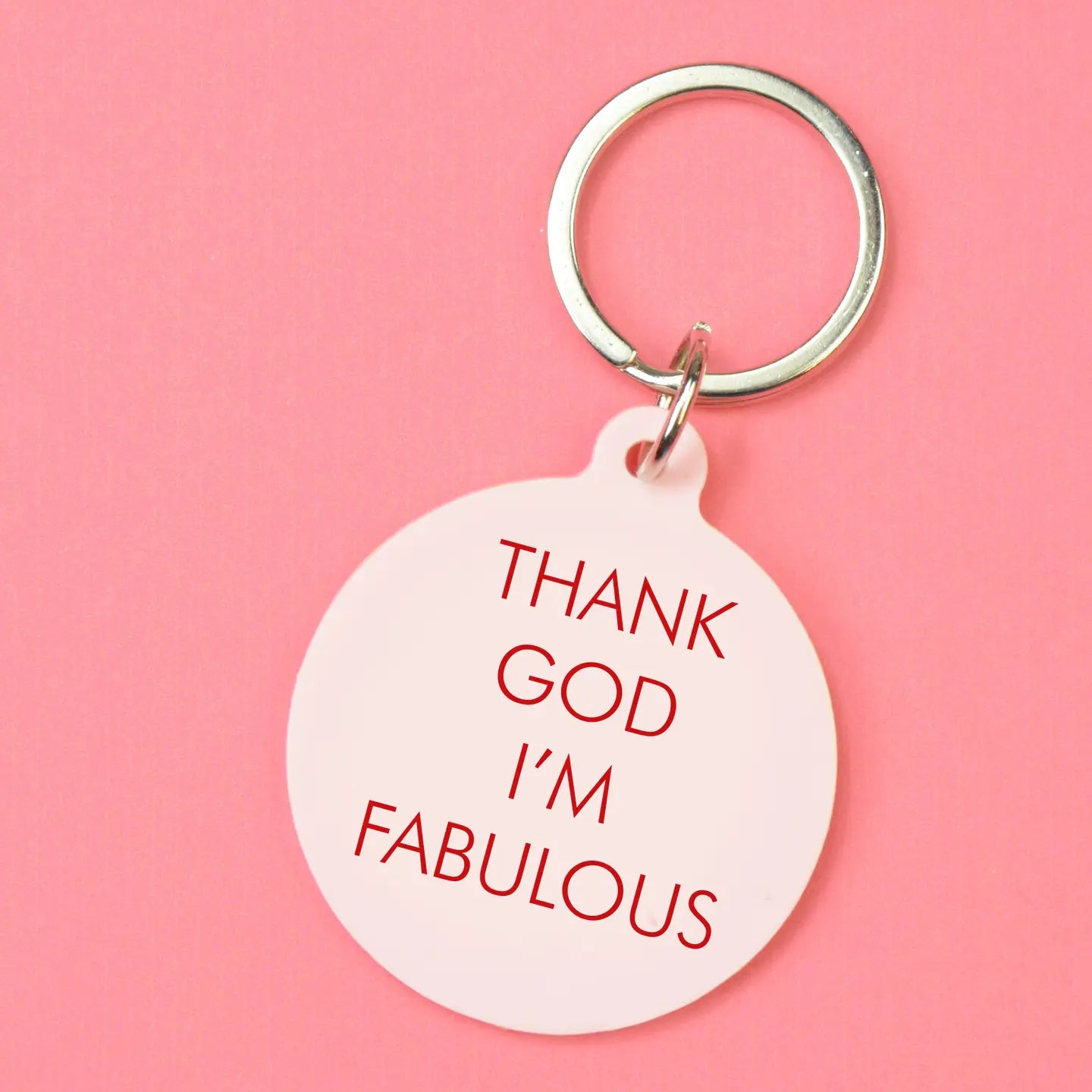 • 'Thank God I’m Fabulous' engraved on pink acrylic with red engraving and silver keyring.