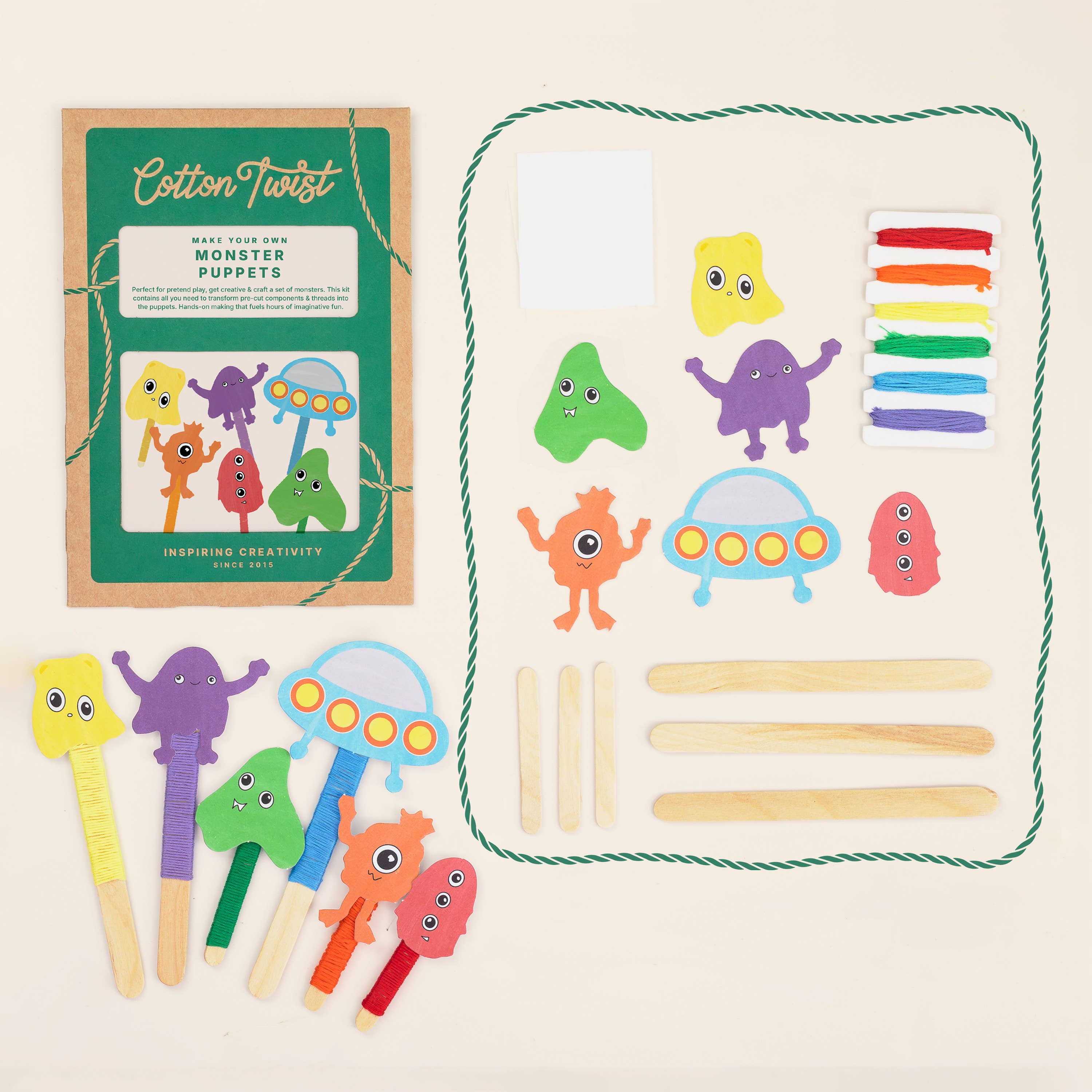 • Super fun monster puppet kit, by Cotton Twist. Children can use the cut outs, lolly sticks and thread to create their very own monsters.