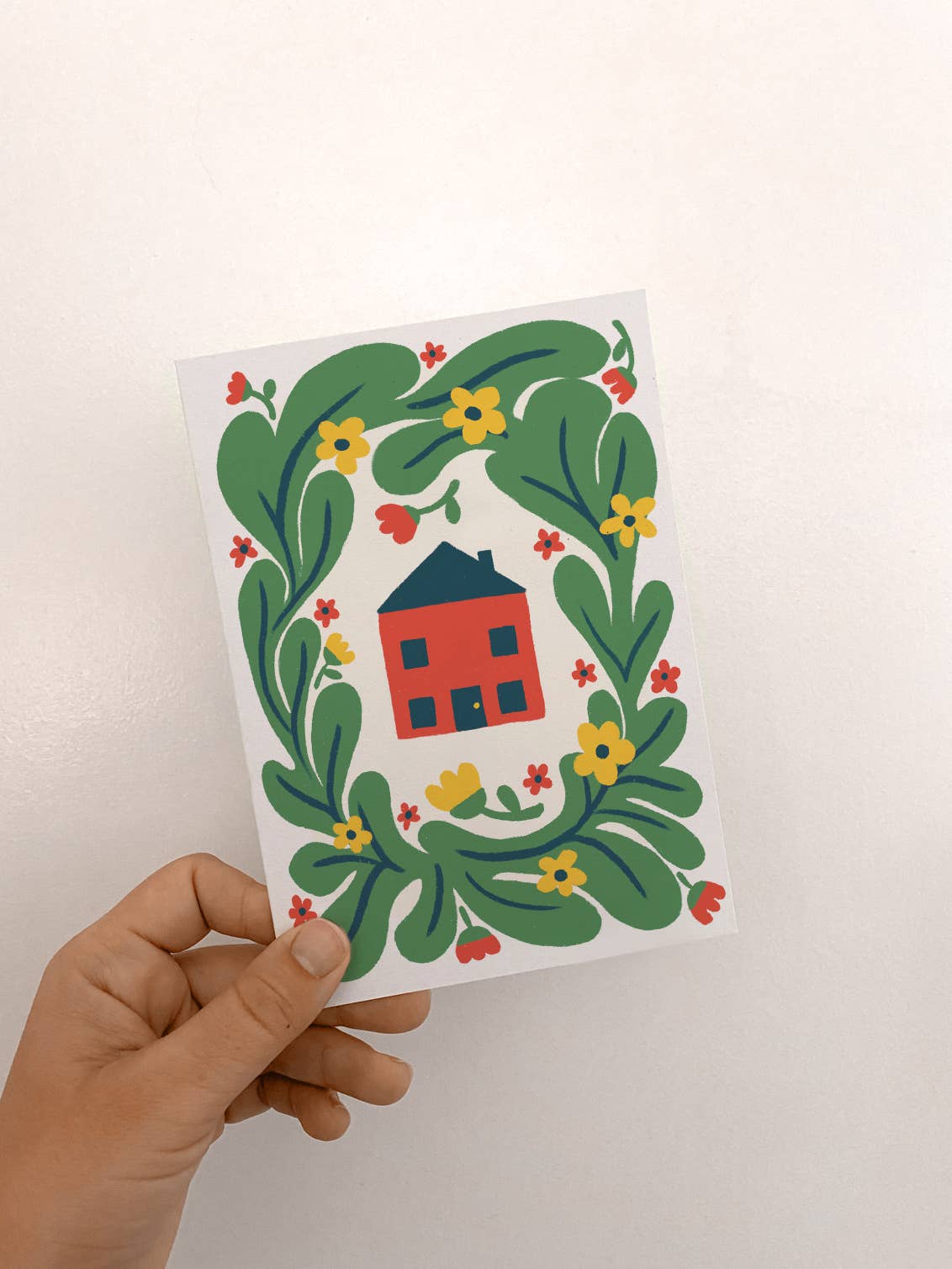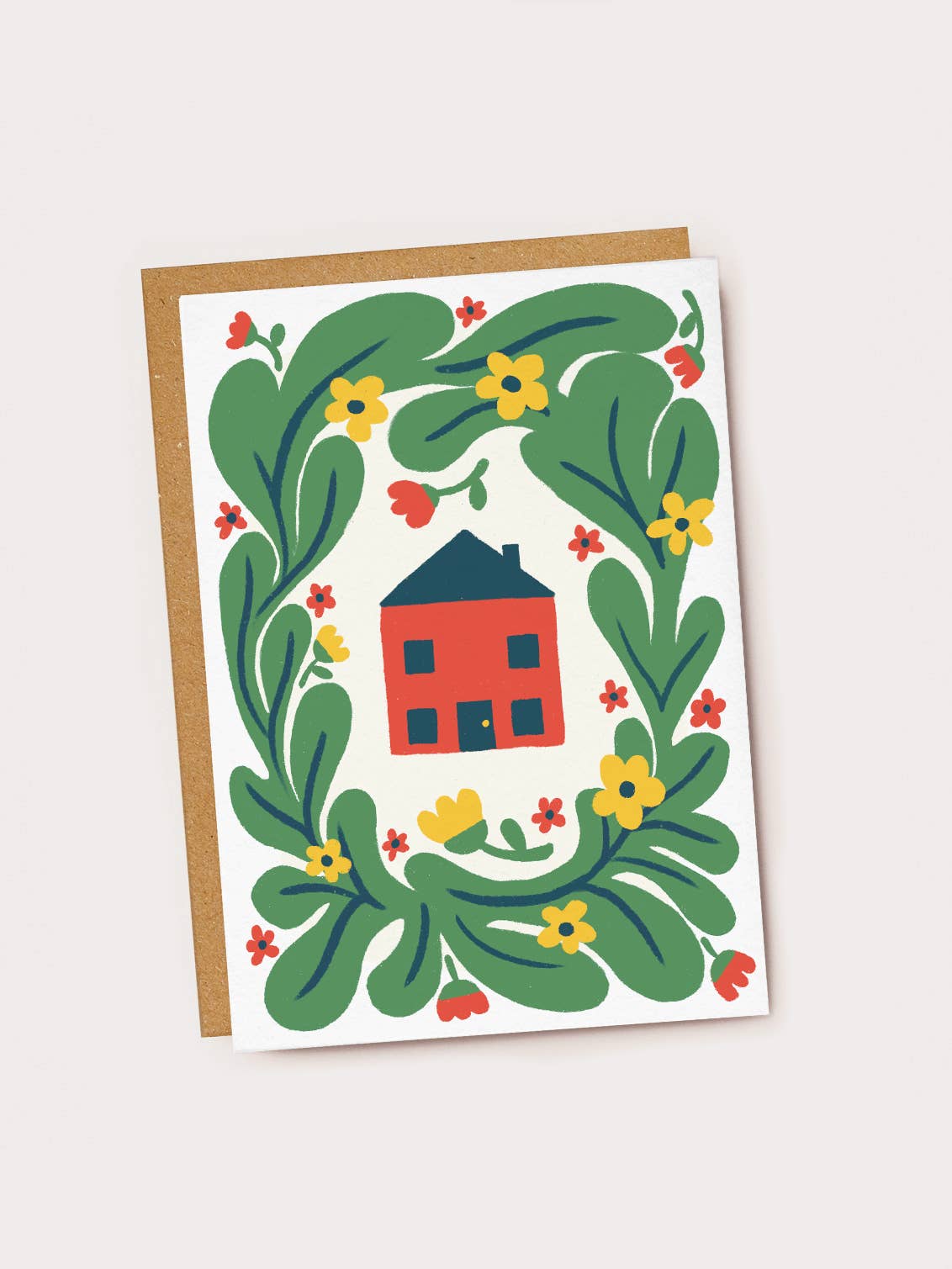 • A beautifully joyful new home card with a sweet little red folk house and a bold floral border, by Jade Fisher.