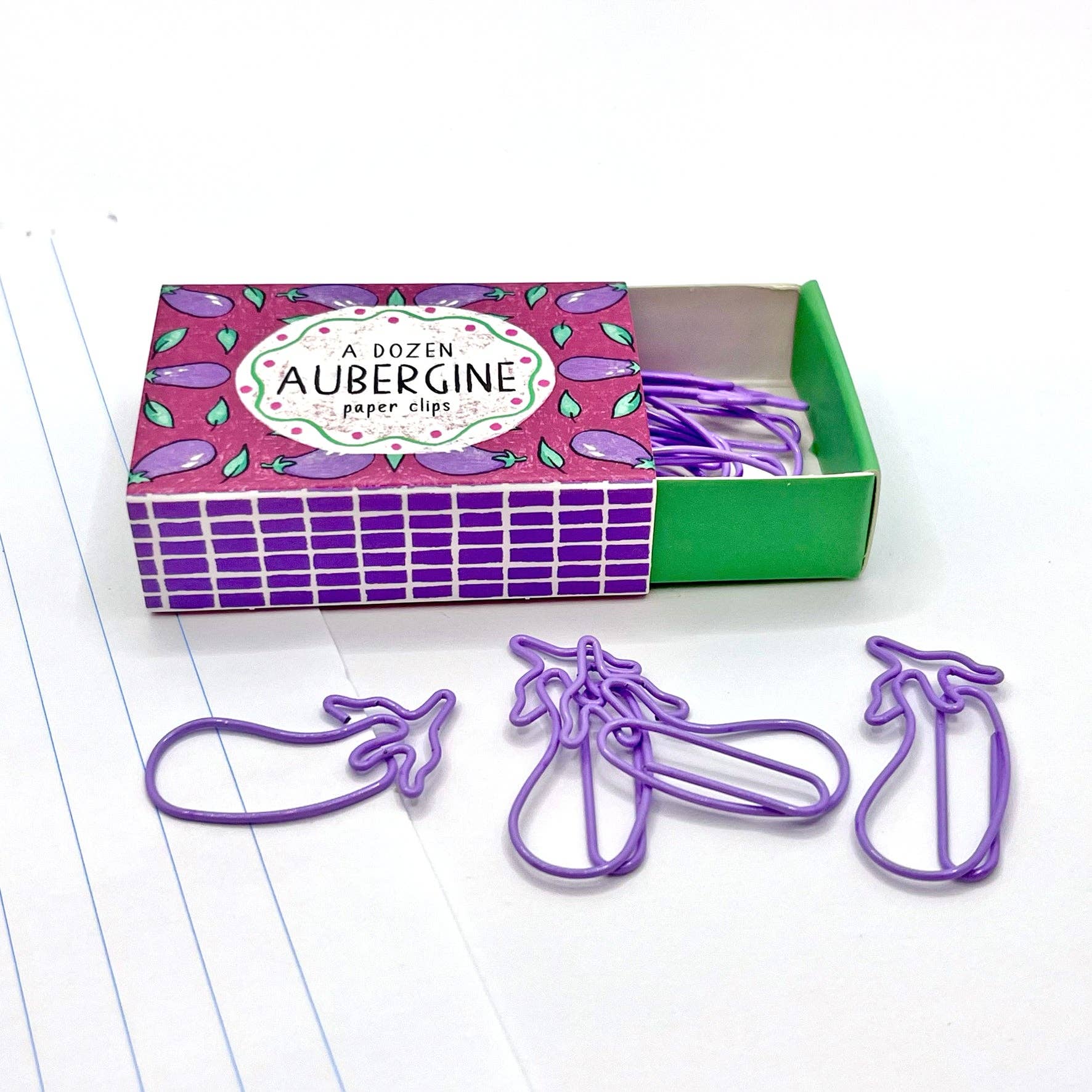 • A fun set of twelve purple coloured aubergine paper clips in a beautifully illustrated box.