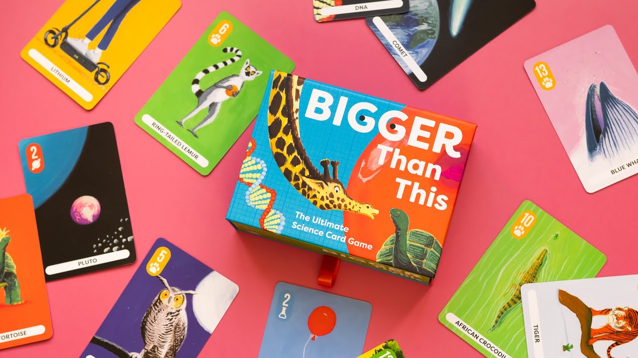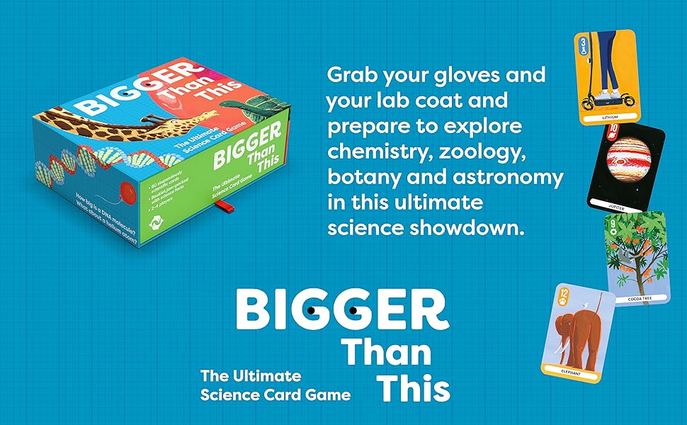• In Bigger Than This, the four suits have been replaced by four different fields of science – chemistry, zoology, botany and astronomy. Collect cards by asking your opponents for cards that are either bigger than or smaller than one of the science elements in your hand. If your opponent can’t satisfy your request, you’ll win the round. Keep an eye out for the eight wildcards that will cause a malfunction in the lab – they really throw a spanner in the works!