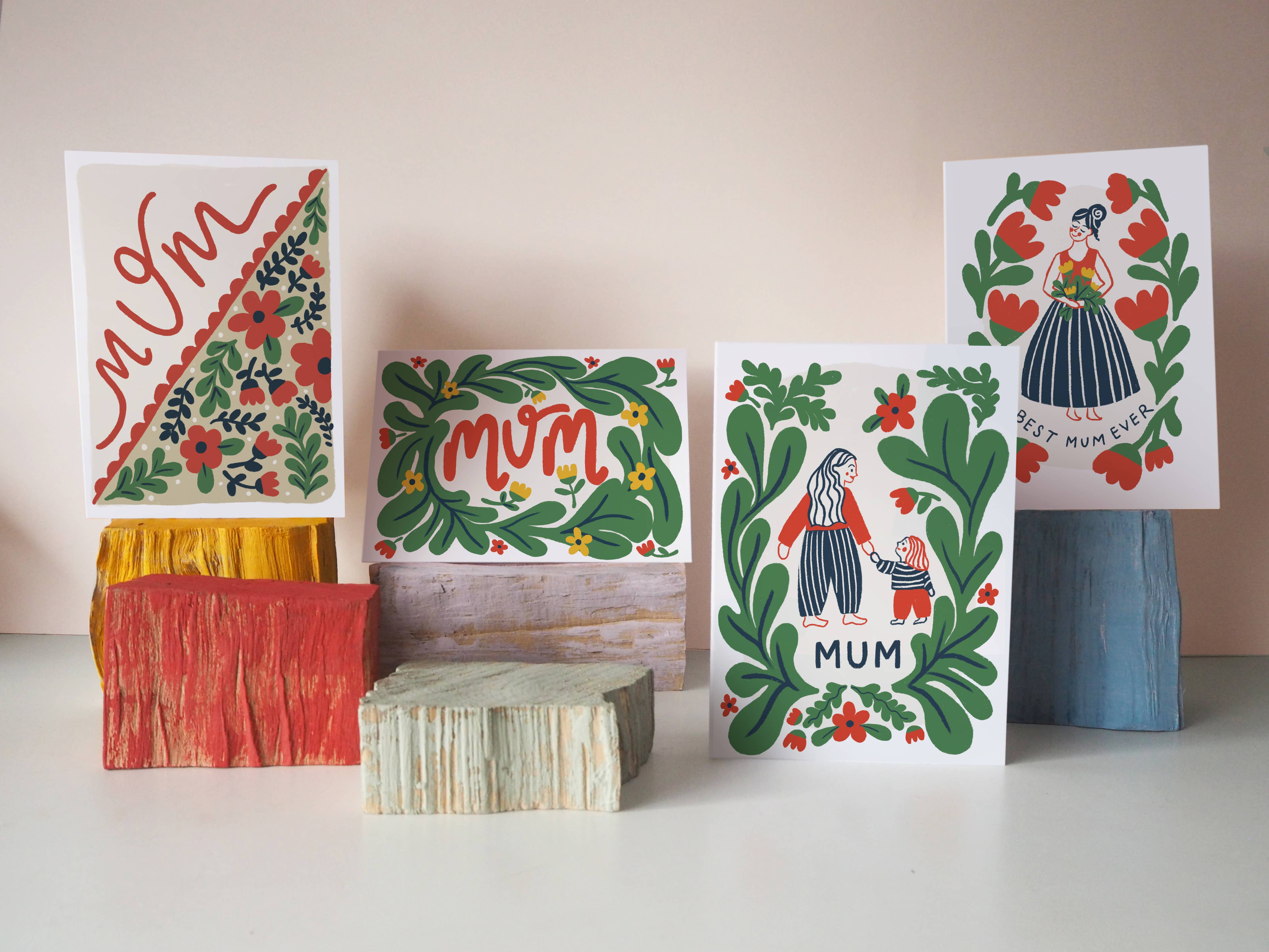 • A fun illustrated card, by Jade Fisher. Perfect for Mother's Day or another hero in your life, featuring a red and yellow wreath and a hand lettered 'Hero' message.